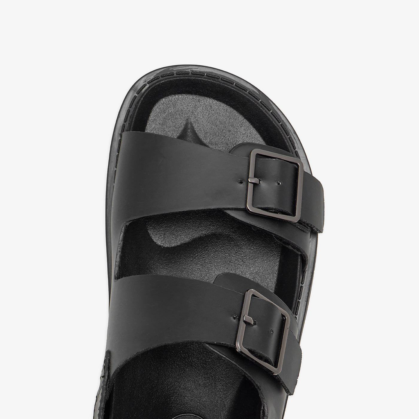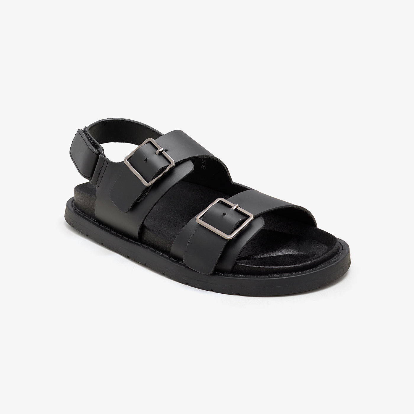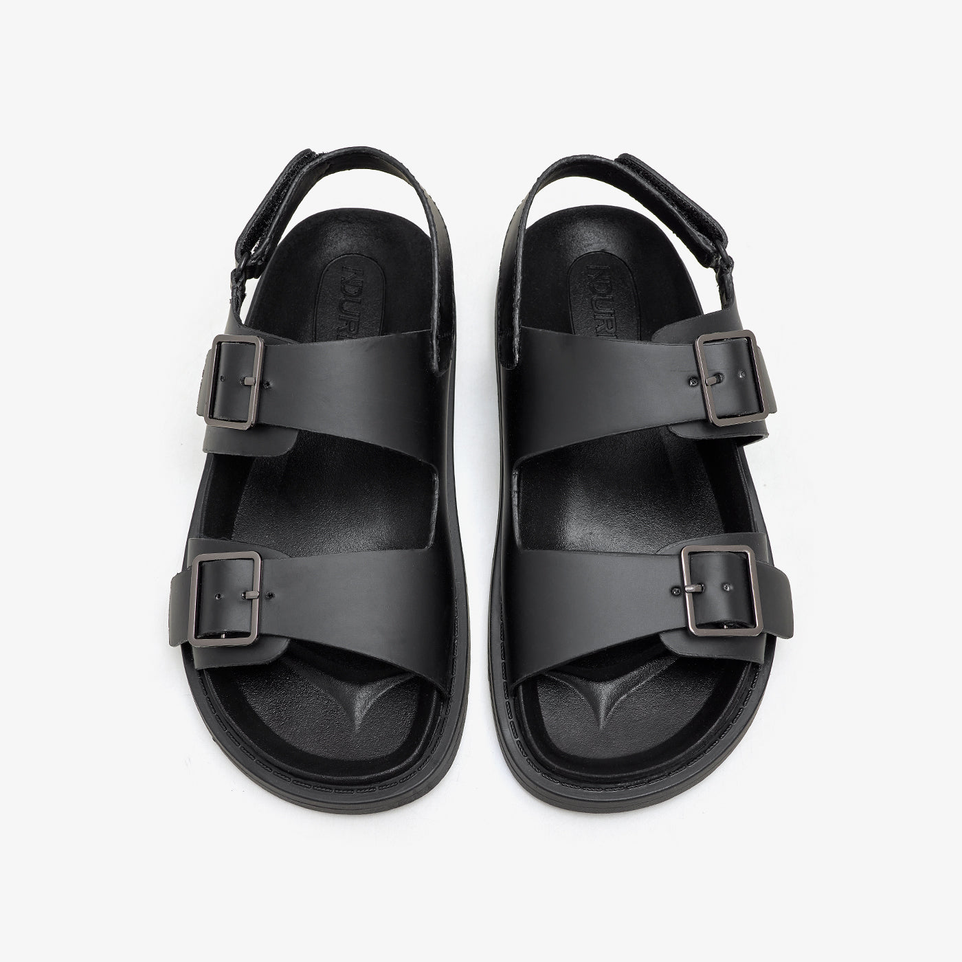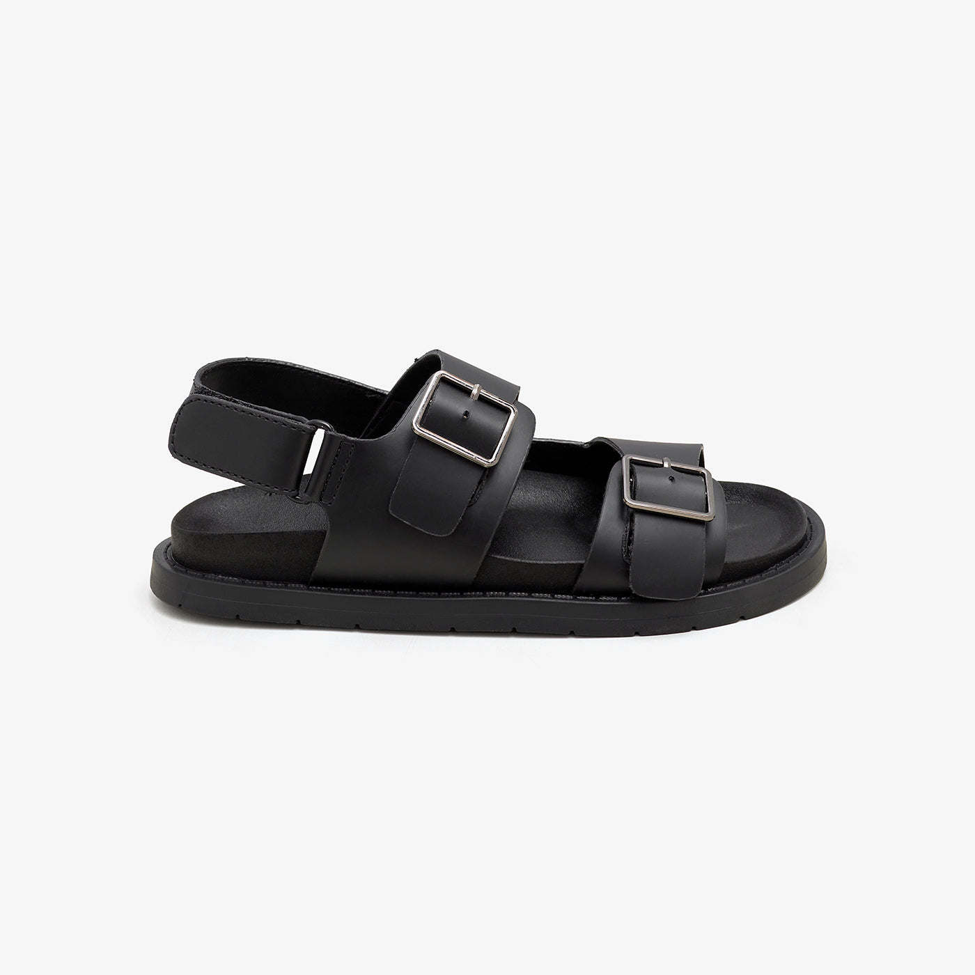 These sandals feature a buckle, a round toe shape, and a padded sole.