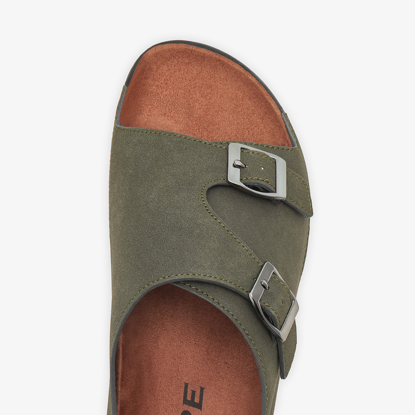 Slides in an olive tone. Featuring a double-strap silhouette with buckle detailing and an open-toe design.