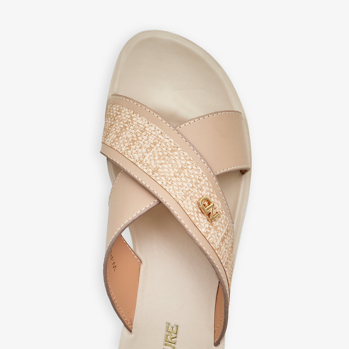 Women’s slides featuring crossed straps with a textured finish and subtle metal detail. Designed in a clean, minimal style for a refined everyday look.