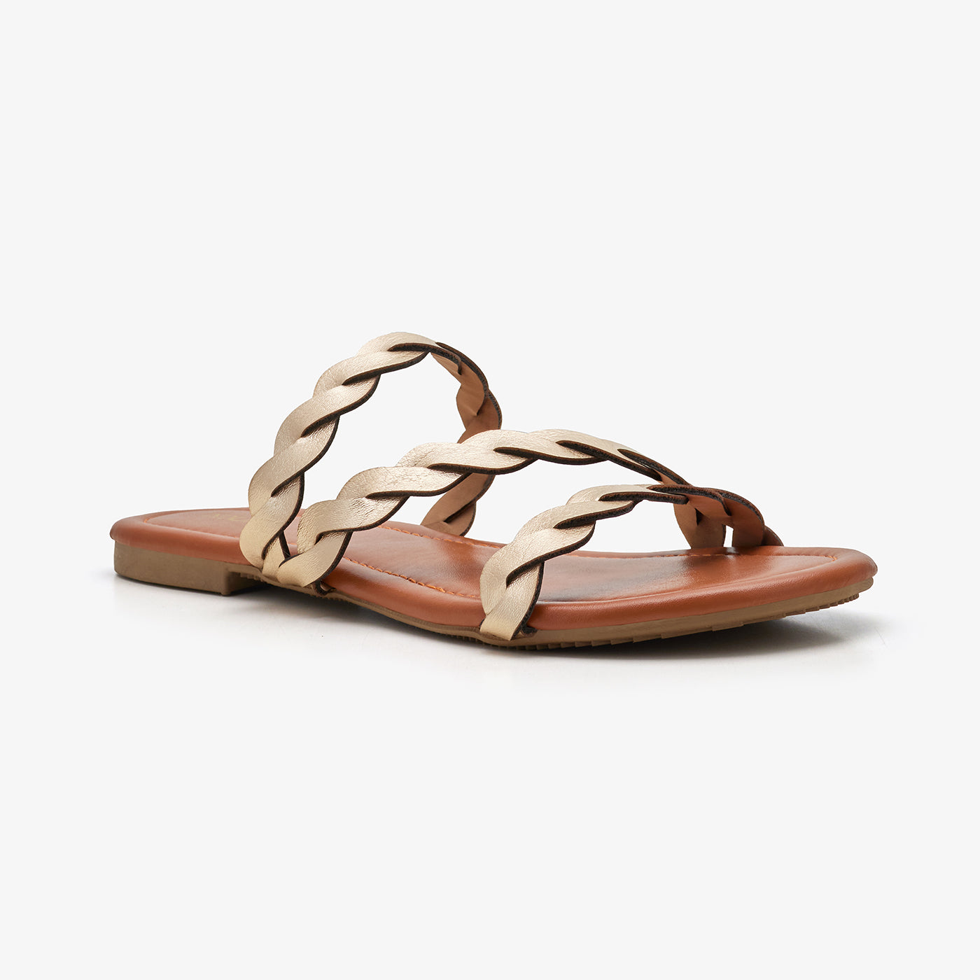 Women’s flat slides featuring metallic-effect interwoven straps across the front. Designed in a slip-on style and set on a flat sole with a contrast base. Ideal for effortless everyday wear.